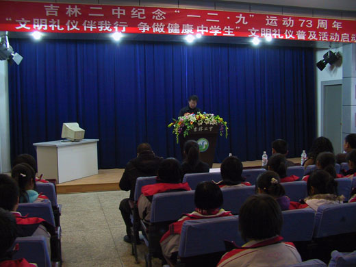 2008年12月9日,我校在演播厅及各班教室举办了吉林二中纪念“一二•九”运动73周年暨“文明礼仪伴我行 争做健康中学生”文明礼仪普及活动启动仪式。