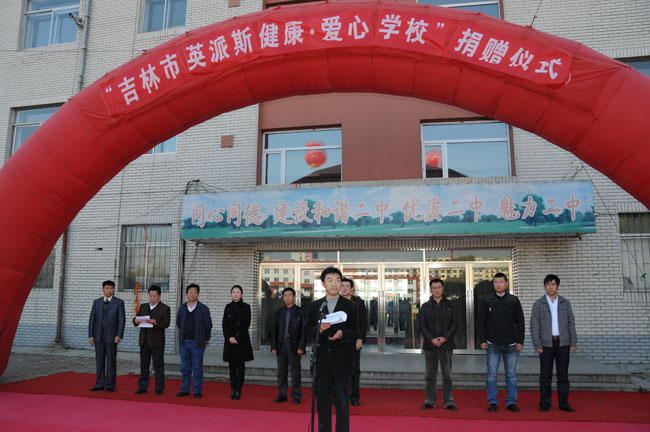 2010年10月29日上午,吉林二中隆重举行“吉林市英派斯健康·爱心学校捐赠仪式”。副市长杨金顺、市体育局局长杨中平、市教育局局长佟剑秋、市体育局副局长高延风、市教育局副局长钱大波、省英派斯健身健康管理有限公司总经理张歌、副总经理雷大伟、副总经理助理邱阳、市英派斯健身俱乐部解放路馆总经理冯明杰出席了会议。会议由钱大波副局长主持。新闻综合频道、《直播江城》栏目组等市内主流媒体记者对仪式进行了现场报导。