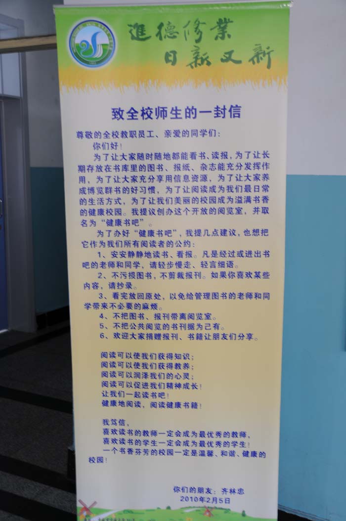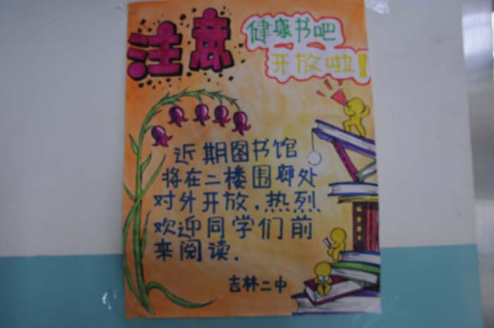 吉林二中为活化“新健康教育”形式,充实“新健康教育”内容,丰富“新健康教育”载体,拓宽师生视野,增加师生知识储备量,提高师生文学修养,使师生养成阅读的好习惯,于3月10正式启用了开放式的“健康书吧”,对全校师生全天开放。