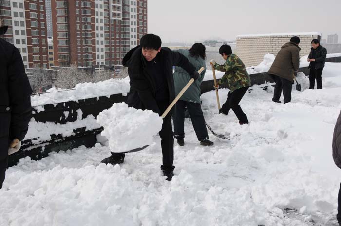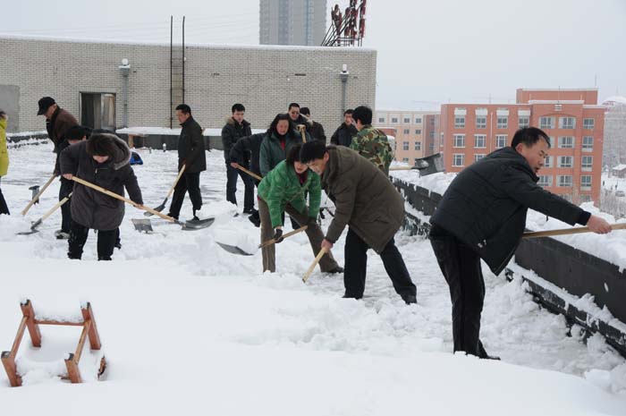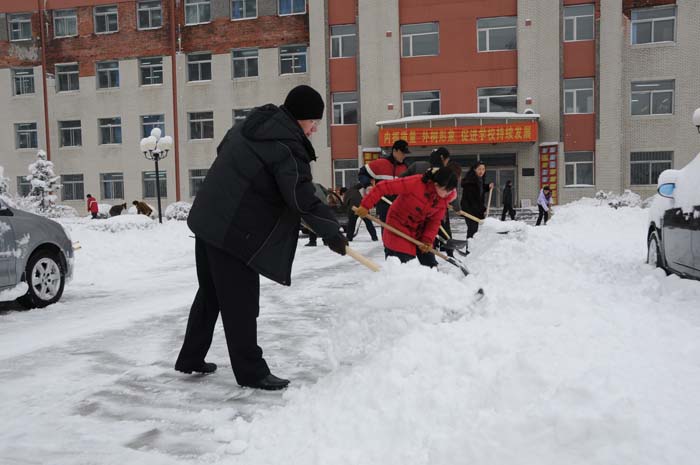 3月15日早晨上班,我校由校领导和部分无课教师自愿组成了清雪组,清理了学校主要出行道路上的积雪。另外,楼顶积雪严重影响楼体安全,上午30余名教职员工义务清除教学楼顶积雪,但由于积雪太多,校园内仍留有大量积雪,学校党委向全校师生发出倡议,号召全校教职工特别是党员同志积极参加义务清雪,全校学生特别是共青团员利用课余时间自愿参加义务清雪。