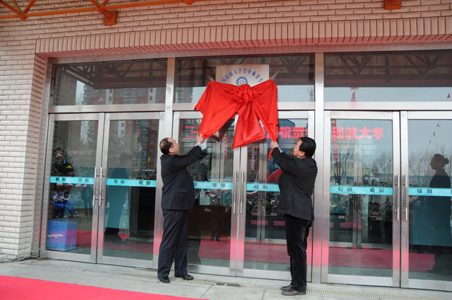 | 中国民航大学党委书记潘志祥和市政府副秘书长李建华揭牌 |