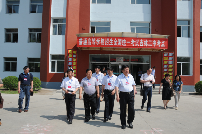 6月7日,吉林市政协主席郑文斌,吉林市人大副主任、总工会主席吴立疆,吉林市副市长杨金顺在相关部门负责人的陪同下,来到吉林二中考点巡查考场,并慰问教务人员。