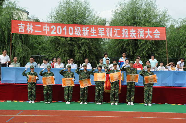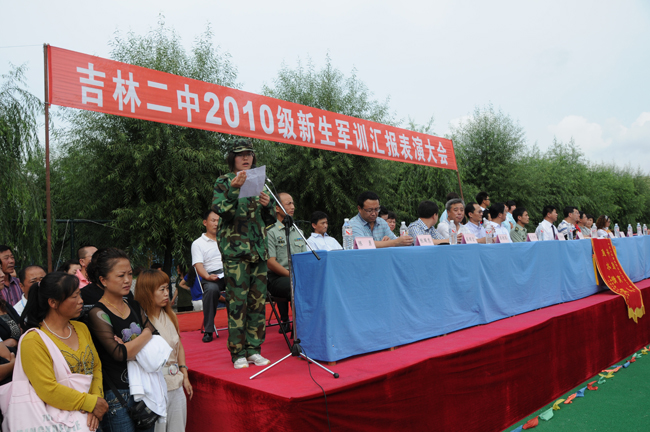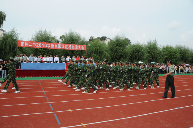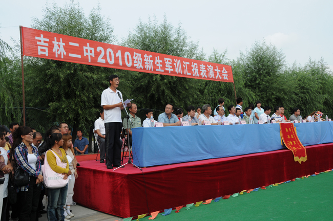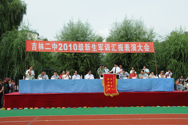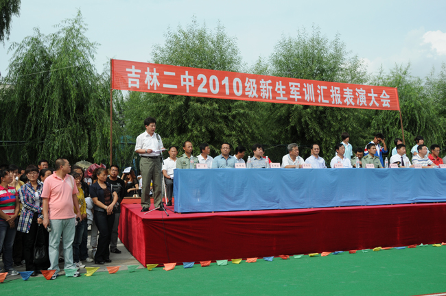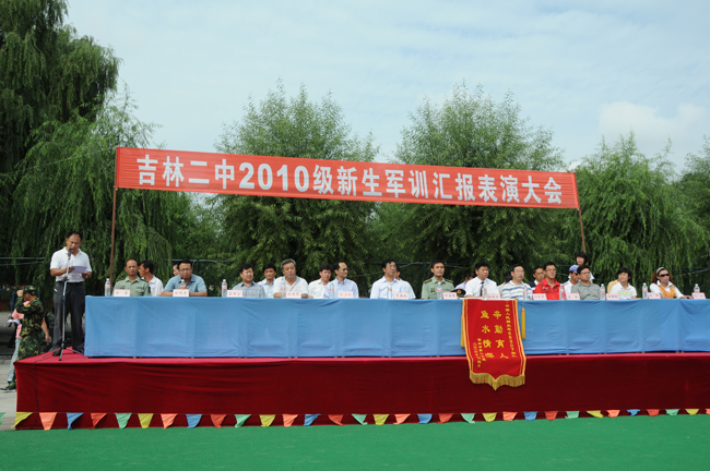 2010年9月4日,吉林二中在校园田径场举行了“2101级新生军训汇报表演大会”。出席本次大会的领导有市教育局副局长于海波、张彦明,作训部队首长邱望伟和军官李勇,体卫艺处处长秦德恩、基础教育处处长刘长泉,副处长祝颖、张国慧,校外办主任宋彬,副主任刘欣,纪检委副书记、团委书记姜国富,团委副书记周国辉。新生家长也参加了本次表演。