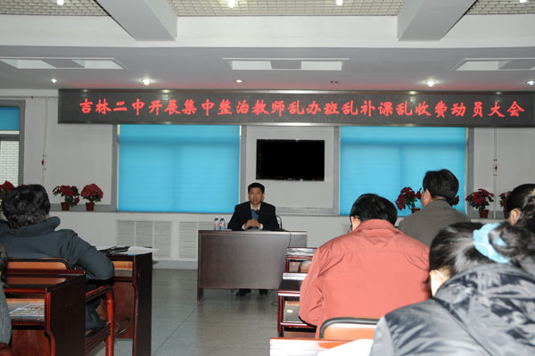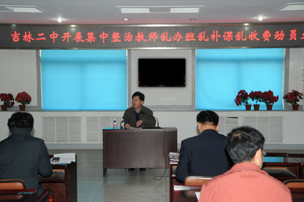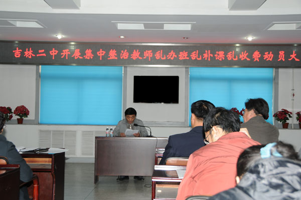 会上,左英凯书记,王星石副校长分别宣读了《吉林市教育局关于开展集中整治中小学校和教师乱办班乱补课乱收费活动方案》,《吉林市第二中学校关于开展集中整治中小学校和教师乱办班乱补课乱收费活动方案》及《吉林市教育局关于对中小学校和教师乱办班乱补课乱收费行为处理暂行办法》。