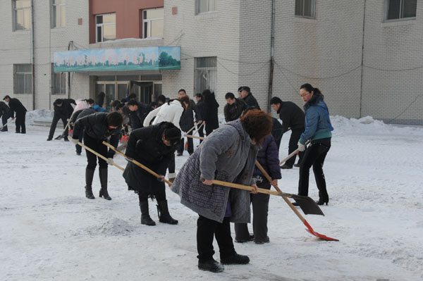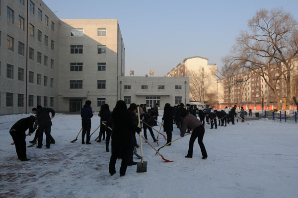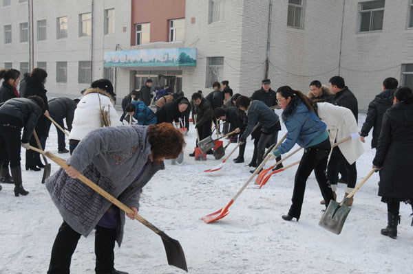 新学期伊始,正值初春,但天气仍然比较寒冷,学校操场仍留有很多积雪,给师生出行带来了很大的不便,也使学生没有了活动场所。为还学生们活动空间,给师生的出行创造方便,吉林二中的教师们于2011年2月22日,在工会的倡导下拿起工具,积极投身到扫雪队伍中,队伍在不断壮大,积雪在迅速的消减。几个小时过后,学校东门后的被雪掩盖了一个假期的小操场重新与学生们见面了,学生们又可以在乒乓球台上挥洒自如的舞动手中的球拍了……
