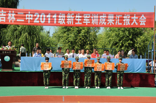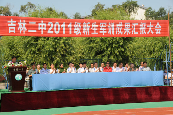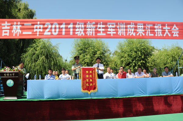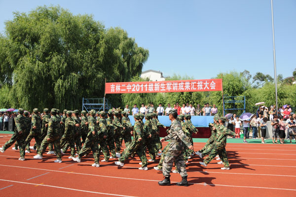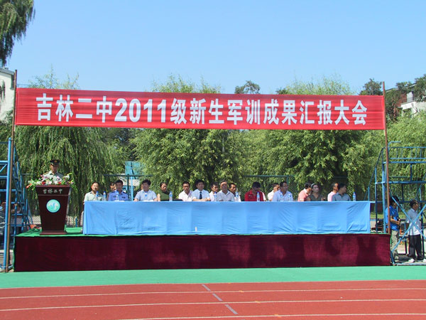 2011年8月19日,吉林二中在校园田径场举行了“2111级新生军训成果汇报大会”。出席本次大会的领导有市教育局体卫艺处处长秦德恩、校外办主任宋彬,副主任刘欣,基础教育处副处长张国慧,团委副书记周国辉及作训部队首长。新生家长也观看了本次表演。