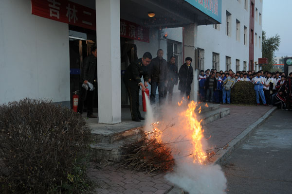 下午4时,随着一声警报,消防逃生演练活动正式开始了,吉林二中的应急预案领导小组成员按应急预案的要求到达各自指定地点,组织火场疏散逃生演练,宿舍楼内的全体师生有序、迅速地逃离了着火现场。高新大队轻型车厂消防中队赶到现场,侦察组利用墙壁消火栓出一支枪堵截火势,灭火组利用5吨欧曼泵浦水罐车出一支枪进行强攻灭火,大火随即被扑灭。随后,消防中队官兵现场指导舍务老师和部分住宿生如何使用灭火器进行灭火。