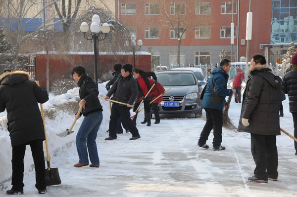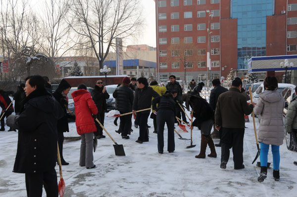 新学期伊始,正值初春,但天气仍然比较寒冷,学校操场仍留有很多积雪,给师生出行带来了很大的不便,也使学生没有了活动场所。为还学生们活动空间,给师生的出行创造方便,吉林二中的教职员工们于2012年2月22日清晨,自发的拿起工具,积极投身到扫雪队伍中,队伍在不断壮大,积雪在迅速的消减。2个小时过后,学校教学楼前后主要道路及学生主要活动场所的积雪都被清理干净了。