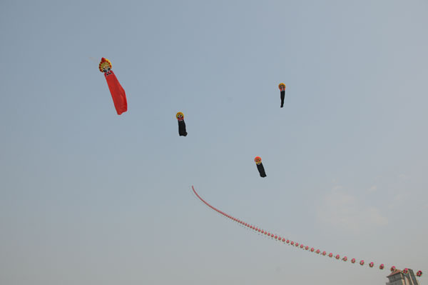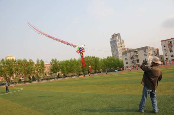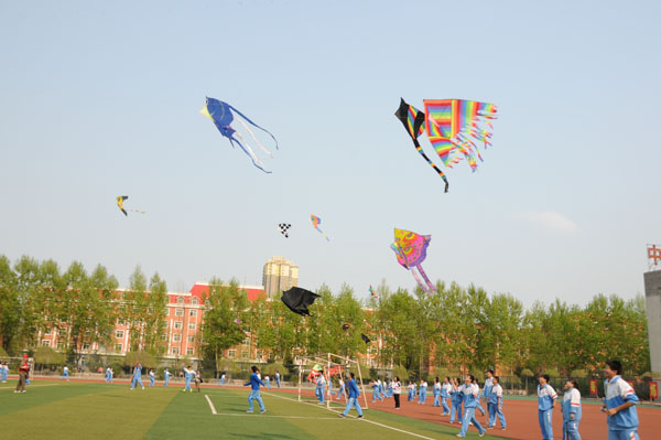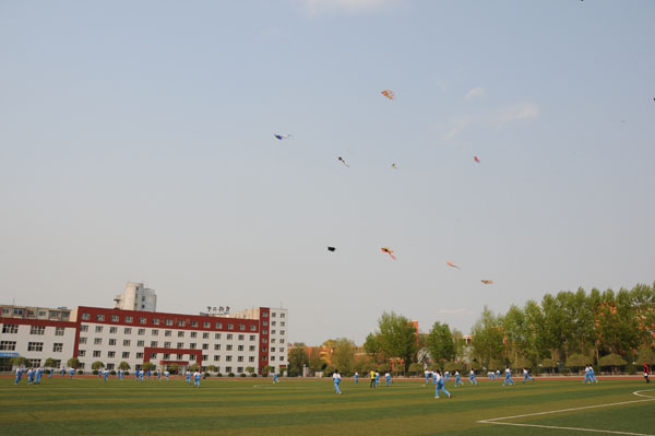 放飞梦想”校园风筝文化节,1500名学生和50位教师在塑胶运动场参加了活动。市风筝协会专家应邀参加本次活动,担当本次比赛的裁判并做了精彩的风筝表演。